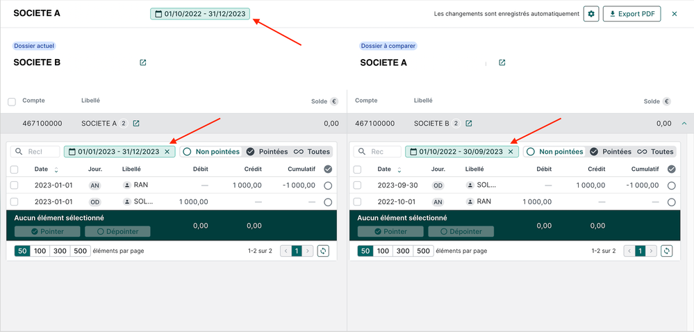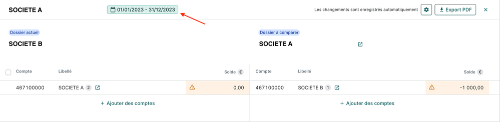 En modifiant la période de l’interco pour renseigner celle allant du 01/10/2022 au 31/12/2023 et en filtrant la période de chaque compte sur l’exercice fiscal de chacun des dossiers, le module n’affiche plus d’écart.