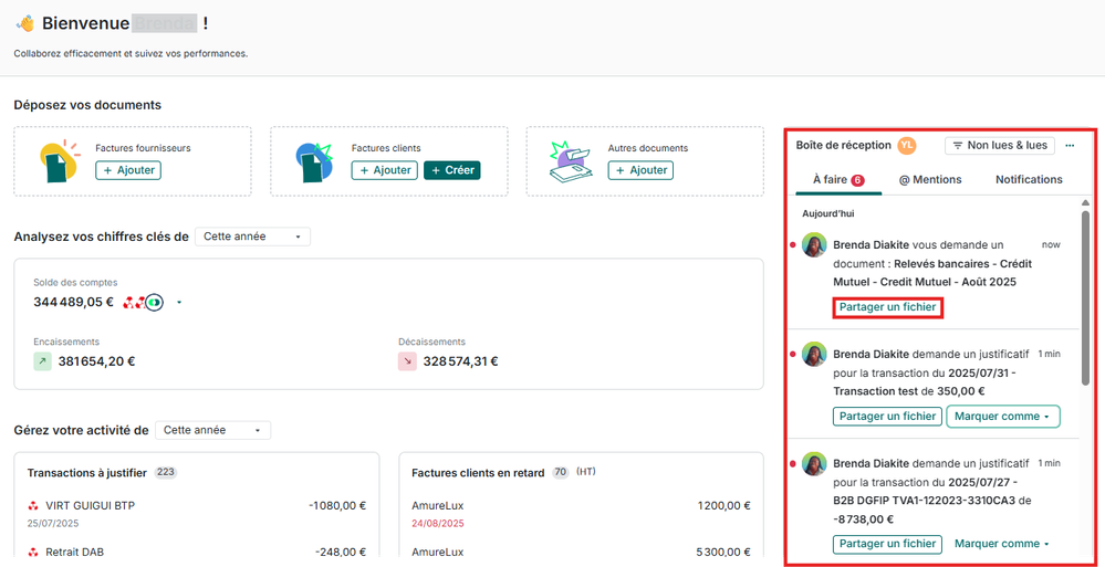 💡 Exemple : Votre comptable vous demande le relevé bancaire du mois pour vérifier les transactions. Vous le déposez en un clic et évitez ainsi plusieurs échanges par mail.