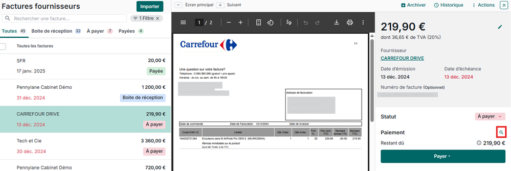 Vous pouvez associer les factures et leur paiement depuis le menu Transactions, ou depuis le menu Achats > Factures fournisseurs (uniquement à partir du Plan Basique).