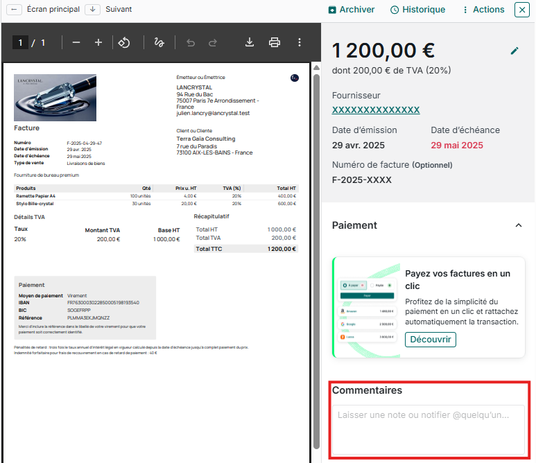 💡 Exemple : Vous payez une facture en espèces ? Indiquez-le en commentaire, votre comptable saura immédiatement comment traiter cette dépense.