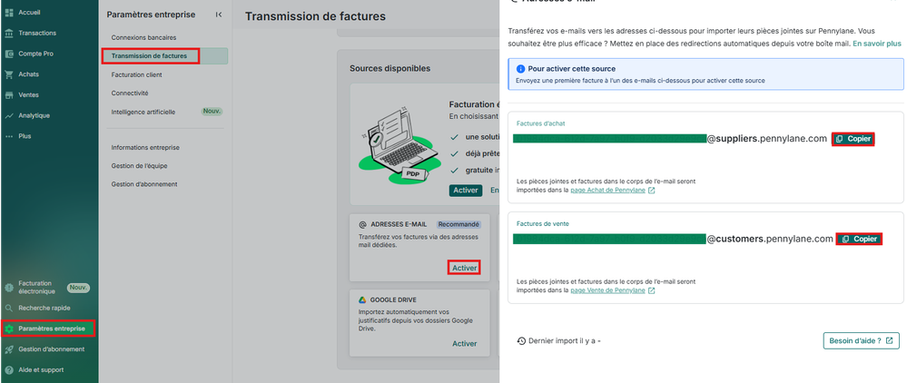 Vous pouvez envoyer vos justificatifs dans Pennylane, sans quitter votre boîte mail ! Pour cela, une fois les adresses Pennylane récupérées depuis le menu Paramètres entreprise > Transmission de factures > Adresses e-mail, il vous suffira de transmettre les mails contenant une facture (qu’elle soit en pièce-jointe ou dans le corps du mail) à l’adresse récupérée (en fonction qu’il s’agit d’une facture d’achat ou de vente).