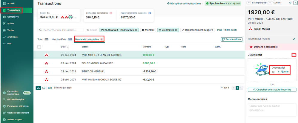 Si une dépense ou un encaissement n’a pas sa facture associée, votre comptable vous enverra une demande comptable. Vous pouvez les consulter facilement depuis la page d’accueil, ou depuis le menu Transactions > Demandes comptables