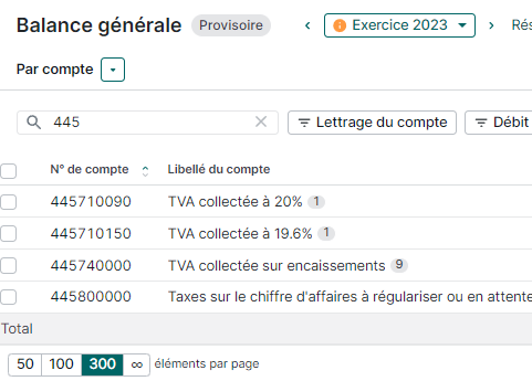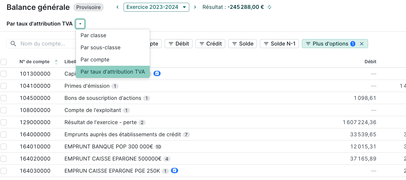 Personnalisez l’affichage de votre balance générale en quelques clics en gérant la granularité de l’affichage en fonction des taux de TVA et des pays d’attribution, directement depuis le sélecteur de comptes.