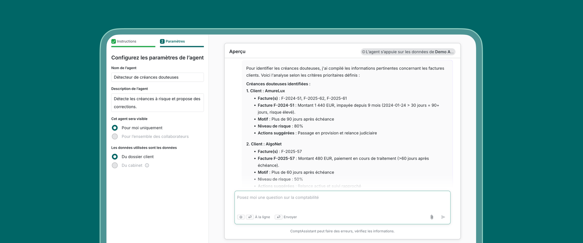 Pour vous permettre d’en faire plus avec le ComptAssistant, nous introduisons la notion d’agents IA. Voyez ça comme une version avancée et collaborative des prompts, une sorte de mode multijoueurs. Les agents utilisent les données de vos dossiers ou de votre portefeuille, exactement comme un collaborateur qui connaitrait bien votre cabinet.