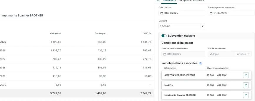 Ce module s'intègre directement avec celui des immobilisations, permettant ainsi un calcul automatisé de l’étalement des subventions, éliminant les erreurs manuelles et économisant un temps précieux.