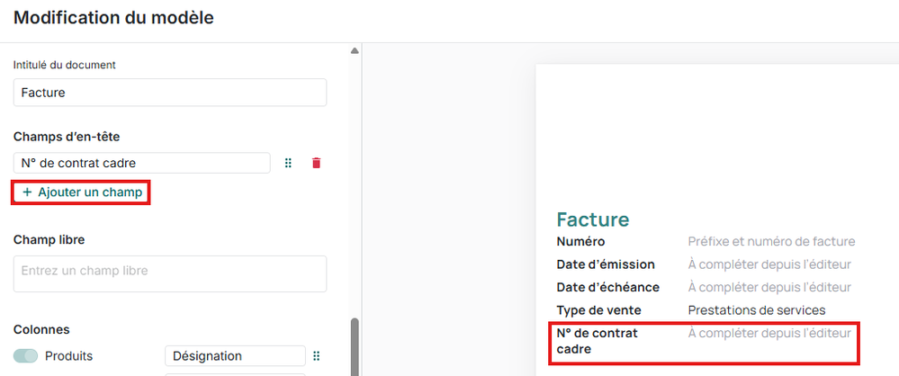 Vous avez la possibilité d'ajouter un champ personnalisé en paramétrant votre modèle de facture depuis le menu Paramètres entreprise > Facturation clients > Documents et modèles :