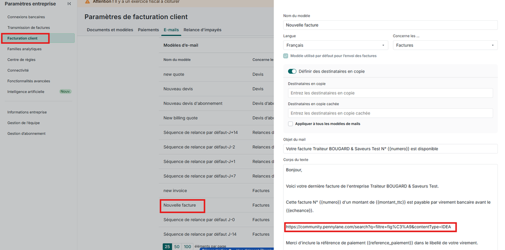 Pour cela, je vous invite à aller dans le menu Paramètres entreprise > Facturation client > E-mails et à modifier le modèle d'e-mail des factures :