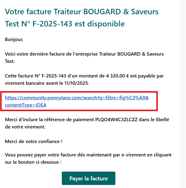 Une fois la facture envoyée à votre client, le lien sera bien cliquable par celui-ci :