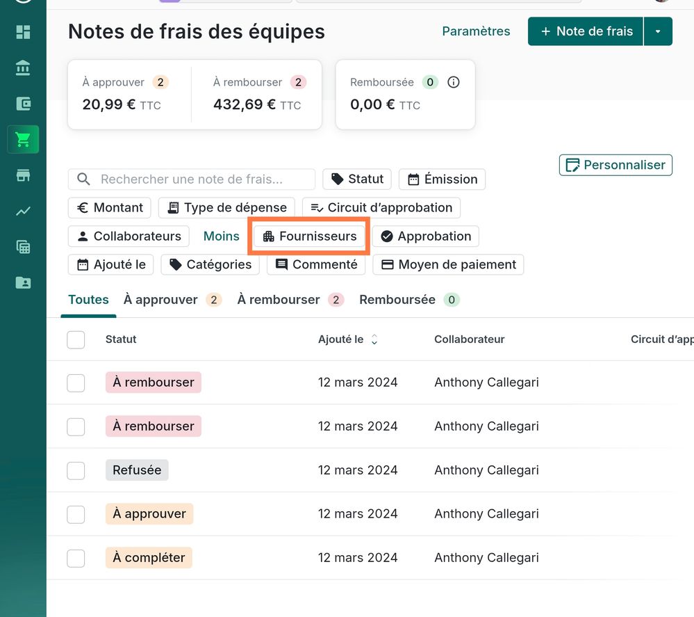 Enfin, il est possible de rechercher une note de frais par fournisseur, en cliquant sur Plus au niveau des filtres, et en utilisant le filtre Fournisseur :
