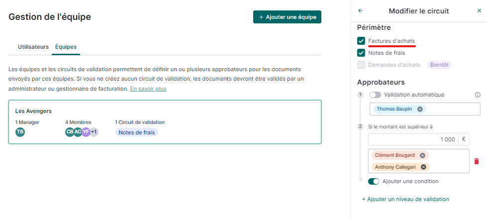 Pour y accĂ©der, je vous invite Ă vous rendre dans ParamĂštres > Gestion de lâĂ©quipe > Ajouter une Ă©quipe (si elle nâexiste pas encore) et cocher Factures dâachat