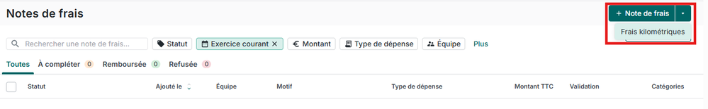 Depuis le menu Note de frais, je vous invite à cliquer sur la petite flèche pour accéder aux Frais kilométriques et ainsi déclarer un déplacement via un itinéraire :
