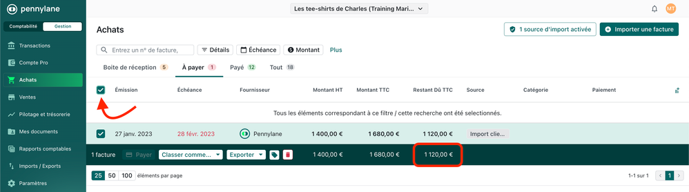 Pour voir le total restant-dû de vos factures d’achat, je vous invite à présent à sélectionner toutes vos factures (en cochant la case de gauche). Le total s’affichera alors en bas de la colonne “Restant Dû TTC”.