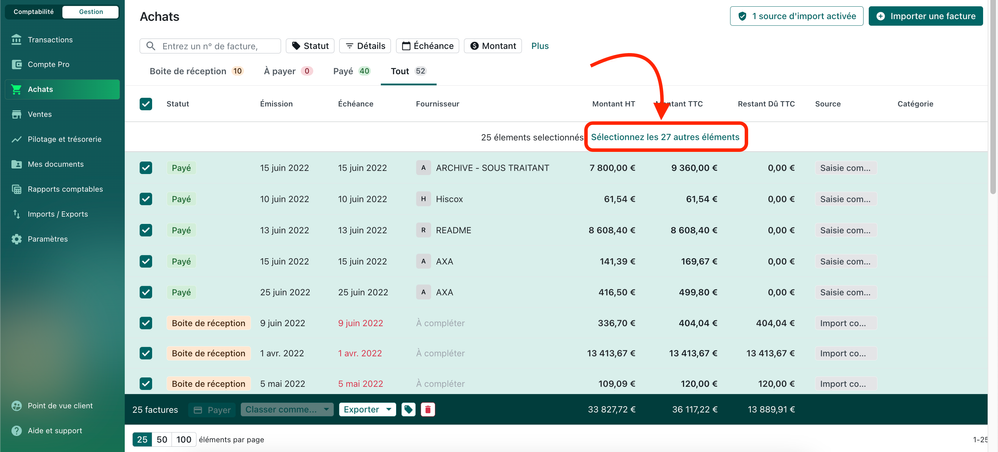 Pour avoir le total de toutes les factures (sur toutes les pages), je vous invite à cliquer sur “Sélectionnez les X autres éléments” comme sur l’exemple ci-dessous 🙂 :