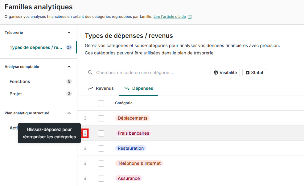 Il est désormais possible de changer facilement l'ordre des catégories analytiques directement depuis le menu Paramètres > Familles analytiques 😊