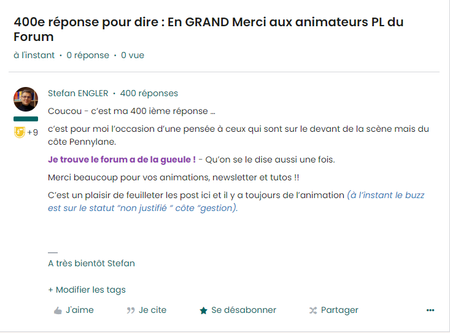 il y a 2 ans400e réponse pour dire : En GRAND Merci aux animateurs PL du Forum