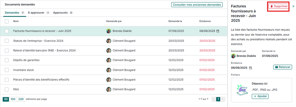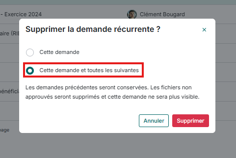 Pour supprimer une demande récurrente, vous la verrez apparaître au niveau des demandes de documents. Je vous invite alors à cliquer dessus, puis à cliquer sur supprimer :