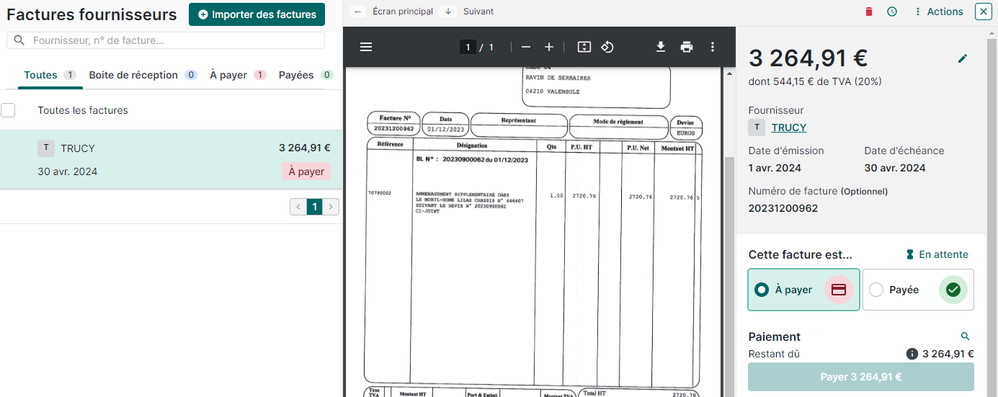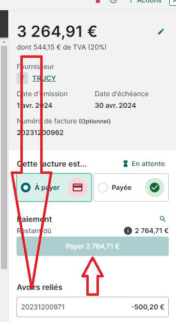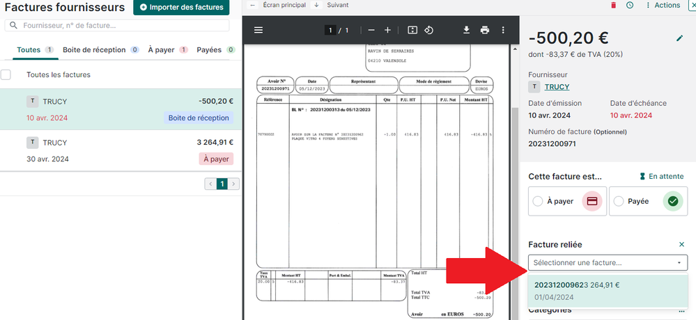 - On importe l’avoir et on le relie tout de suite ou plus tard à la facture :