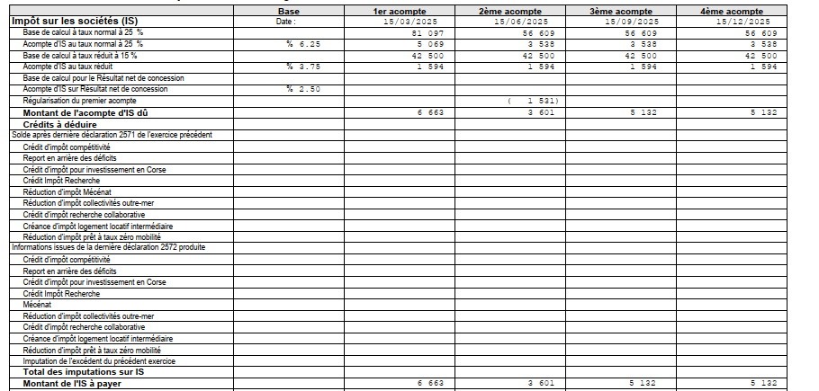Dans notre ancien logiciel Cegid, après le dépôt de la 2572, nous avions un récapitulatif pour les acomptes d'impôt société à payer sur l'exercice suivant,