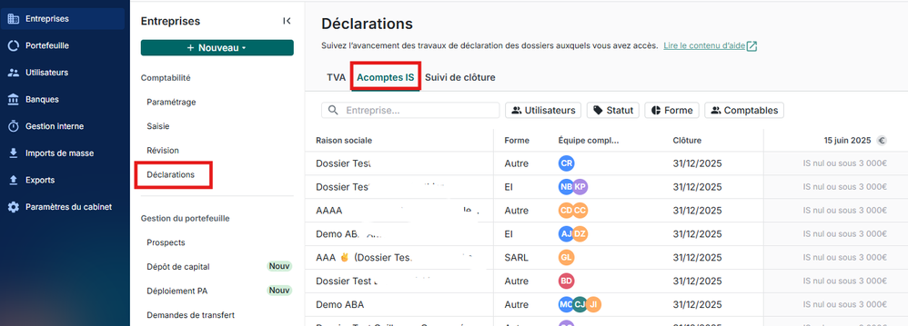 Vous pouvez suivre les acomptes IS de vos dossiers depuis la Vue entreprise > Entreprises > Déclarations > Acomptes IS 😊