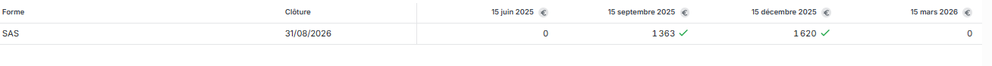 bonjour merci pour le retour mais cela ne convient pas , lorsque l'on va entreprise - déclarations - acompte IS on voit les acomptes payés mais pas ceux à venir; Par exemple ci dessous l'acompte du 15/03/2026 n'est pas complété, il est à 0, nous aimerions avoir un échéancier permettant d'indiquer à nos clients que le 15/03, le15/06 et 15/09/2026 ils auront tels ou tels montants à regler, cela leur permet d'anticiper.