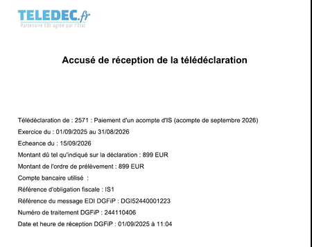 Bonjour, La société clôture au 31/08. Dépôt au 15/09 d'un acompte IS au titre de la période 01/09/2025 au 31/08/2026. L'acompte passe avec une échéance au 15/09/2026. Joli bug ???