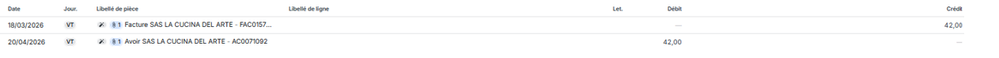 En Avril 2026 : un avoir est généré - l'avoir reste ouvert dans le compte client