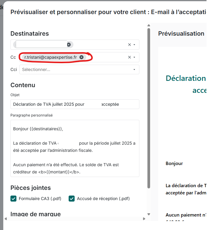 De cette manière, un mail est reçu par la personne ayant réalisé la déclaration au cabinet et le mail client n'est envoyé qu'au client.
