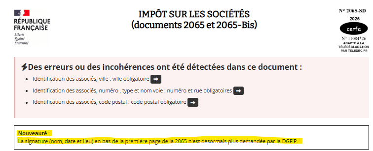 Lors de l'établissement de la 2065 de la liasse fiscale cette remarque apparait :