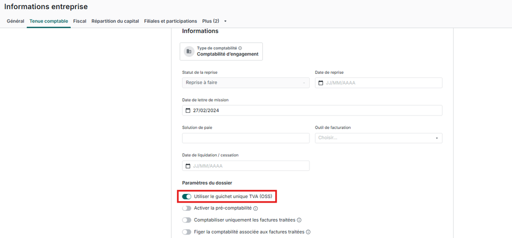 Pour le retrouver facilement et ainsi, tenir votre dossier, je vous invite dans un premier temps à Utiliser le guichet unique TVA (OSS)en l'activant depuis le menu Paramètres entreprise > Informations entreprise > Tenue comptable :