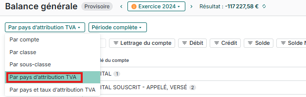 Ensuite, une fois cette fonctionnalité activée, vous pourrez visualiser vos comptes par pays d'attribution depuis le menu Révision > Balance générale > Par pays d'attribution TVA :