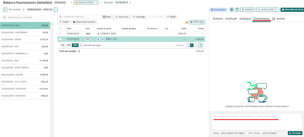 Vous avez la possibilité de directement écrire un commentaire sur les écritures depuis la vue Balance, Journal ou Grand-livre par exemple.