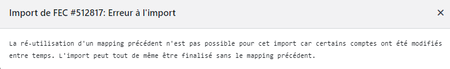 Bonjour, Je souhaiterai importer un FEC mais j’ai un code erreur FEC #512817. Je n’ai pas utilisé un mapping précédent. donc je ne comprends pas ce msg et il ne propose pas de continuer l’impor...