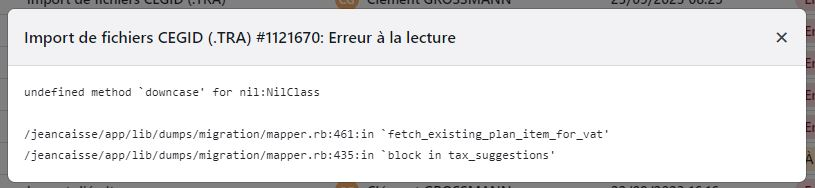 Avez-vous déjà essayé d’importer des écritures en format TRA issues du logiciel REGATE ? Nous avons essayé, et un message d’erreur nous empêche d’aller plus loin, nous n’arrivons même pas jusqu’à l’étape de mapping des comptes. Ci-dessous le message d’erreur qui s’affiche.