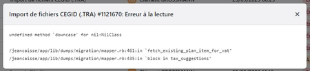 Bonjour, Avez-vous déjà essayé d’importer des écritures en format TRA issues du logiciel REGATE ? Nous avons essayé, et un message d’erreur nous empêche d’aller plus loin, nous n’arrivons même pas j...