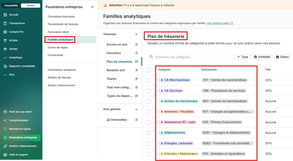 Cela est possible dans le cas d'un dossier en comptabilité de trésorerie, via le menu Paramètres entreprise > Familles analytiques > Plan de trésorerie 😊
