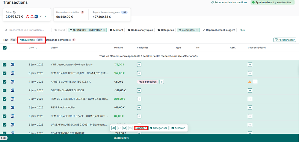 Dans ce cas, je vous invite à vous rendre dans l'interface Gestion > Transactions > Non justifiée > Sélectionner toutes les transactions > Exporter