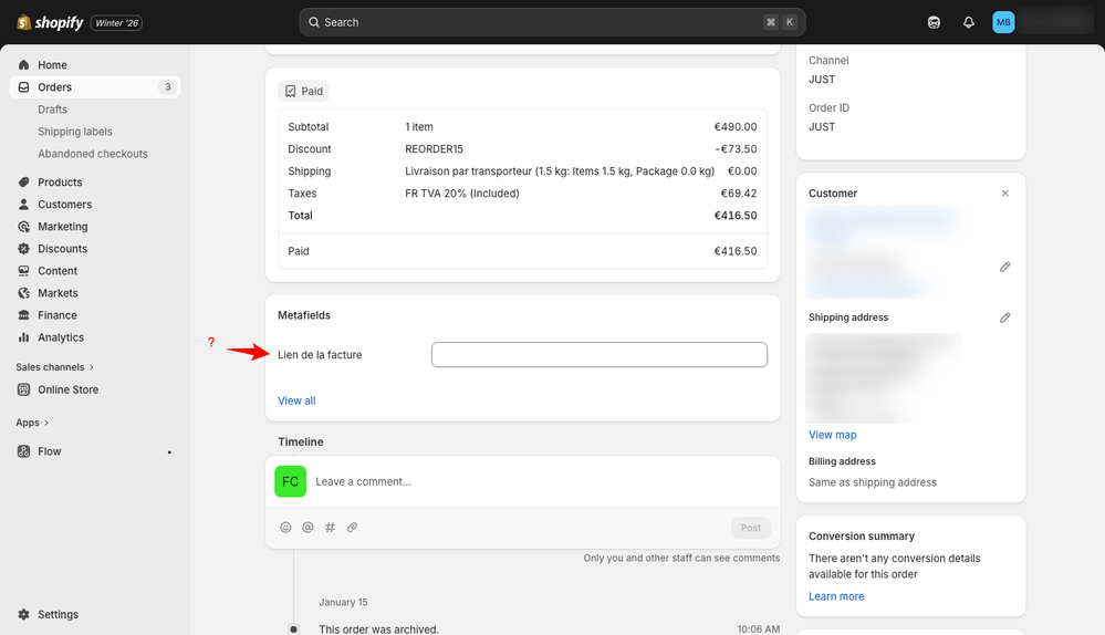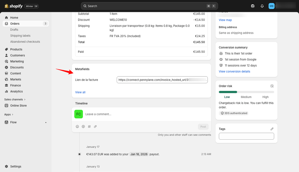 Cette intégration déclenche la génération de la facture Pennylane correspondant à la commande shopify. Nous arrivons par ailleurs à faire remonter dans la majeure partie des cas la facture ainsi générée sur pennylane vers le backoffice shopify, au niveau de la commande correspondante. exemple :