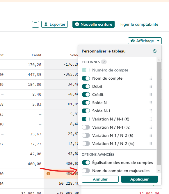 Il y a une case pour mette tous les libellés en MAJUSCULE ici dans l’affichage de la balance :