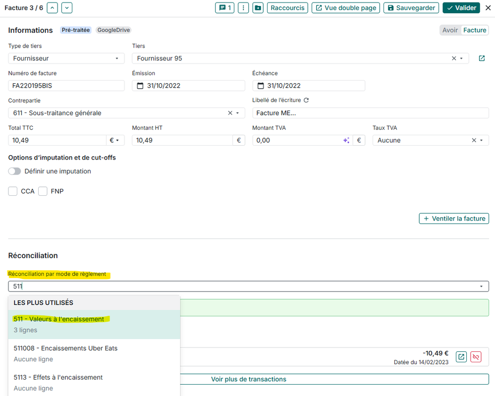 Ainsi, au lieu de commencer par le traitement de la banque, je vous inviterai à commencer par le traitement des factures d'achat, ou il vous suffira d'utiliser le principe de réconciliation pour automatiquement appliquer la bonne contrepartie au niveau de l'écriture de banque 😊