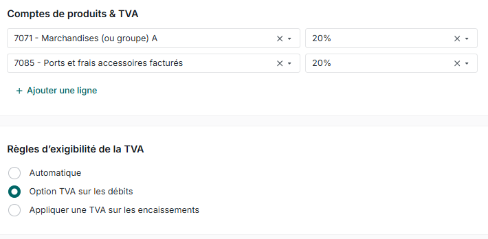 - si un compte lié à de la vente de biens est utilisé -> la TVA sera exigible lors de la facturation