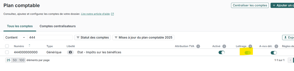 Le compte 444 est déjà lettrable.