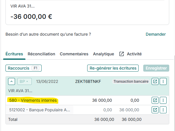 la société a une 2ième banque, et il y a des virements internes , je dois effectuer des réimputation concernant le 5121, mais le logiciel me bloque.
