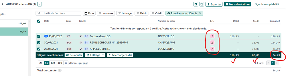 Vous pouvez tranquillement pointer la facture entière avec le paiement partiel. Pennylane va créer un “lettrage partiel” (on les reconnait au petites lettres de l’alphabet.)