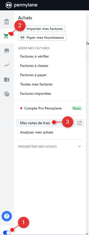 Si vous souhaitez accéder à la liste des notes de frais telle que la voit votre client, passez sur la vue dirigeants, puis “Achats” puis “Mes notes de frais” :