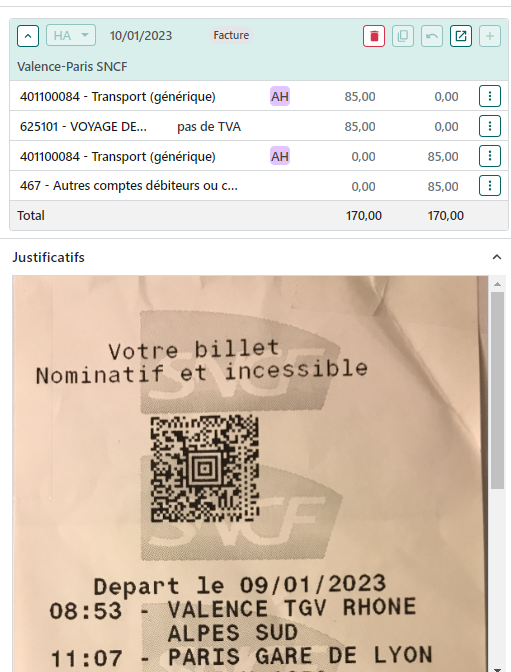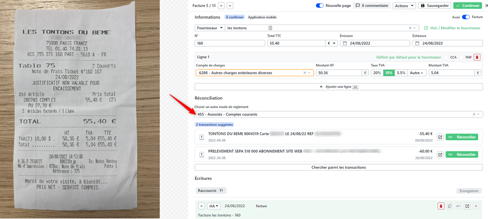 Les factures importées par votre client comme des notes de frais apparaissent comme toutes les autres factures dans votre page de Factures fournisseurs. Si le client a bien indiqué cette facture comme étant une note de frais, la contrepartie 455-[nom du client] s’appliquera automatiquement sur la facture. Vous n’avez plus qu’à la saisir normalement.