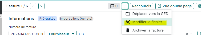 Comme présenté par @Y.Derue, afin “d’annuler” une fusion de factures fournisseurs, je vous invite à cliquer les 3 petits points de l’éditeur de facture, puis à cliquer sur Modifier le fichier.