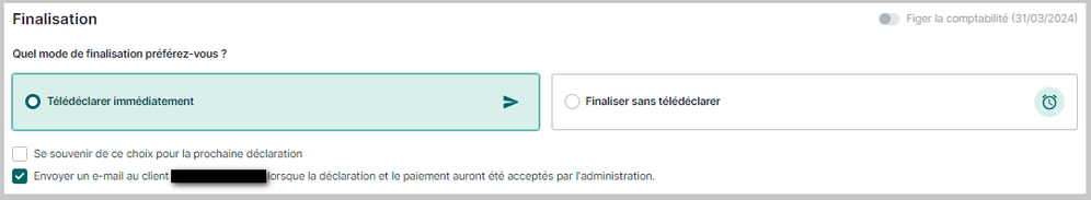 Bonjour, Je remarque à l’instant qu’une nouvelle option est disponible lors de la finalisation de la déclaration de TVA. En effet, nous avons maintenant le choix d’envoyer un mail au client lorsq...