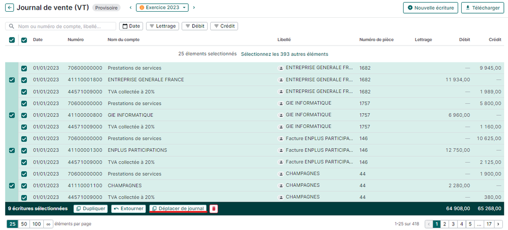 Ensuite, vous sélectionnez les écritures du 1ᵉʳ journal, puis vous cliquez sur Déplacer de journal :