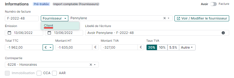 Pour cela, il peut passer par le menu Achats. Simplement, de votre côté, au moment de la saisie de la facture, il faudra renseigner qu’il s’agit d’une facture de vente en sélectionnant “Client” à la place de “Fournisseur” à cet endroit :