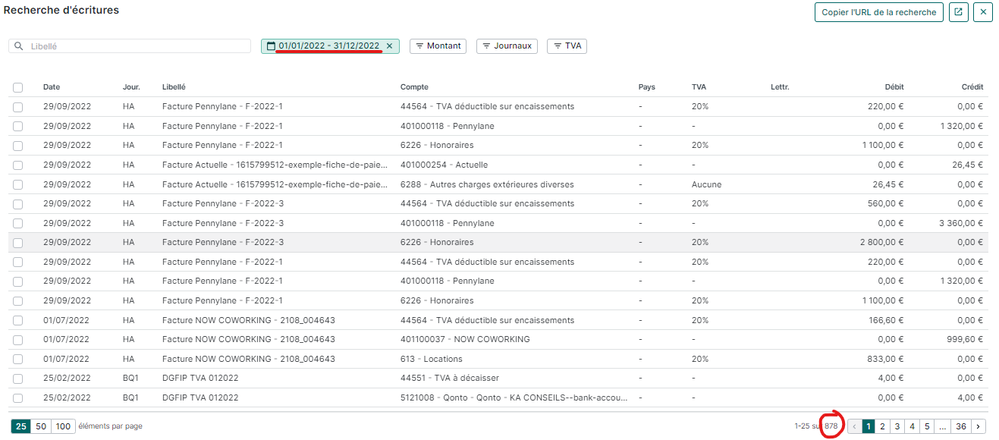 Pour cela, je vous invite à activer le module de recherche d’écritures en cliquant sur la touche R. Ensuite, sélectionner l’exercice ou la période qui vous intéresse. Enfin, vous trouverez le nombre de lignes d’écritures tout en bas à droite, à côté des boutons pour changer de page :